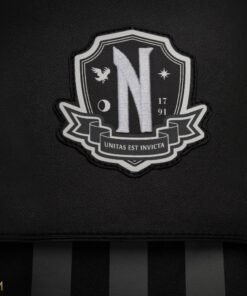 The iconic Nevermore Academy school logo takes centre place, but instead of the classic purple and yellow design, this logo is black and grey. Meanwhile, the bottom half of the backpack is adorned with black and grey stripes.