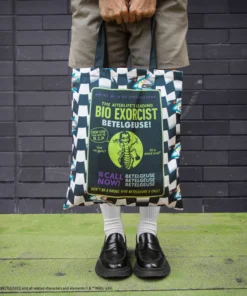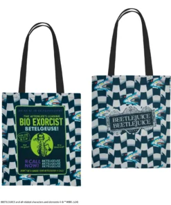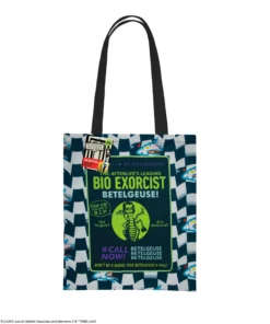 At the forefront, the design playfully invites you to call Beetlejuice’s name three times to summon his mischievous spirit. Collect all the Beetlejuice tote bags and embrace the chaos of the afterlife on your adventures!