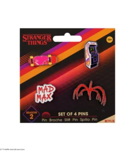 A skateboard, Palace arcade, the Mad Max logo, and Mind Flayer are included in the Season 2 pin set. Constructed from enamel, these pins are renowned for their glossy yet lustrous exterior.