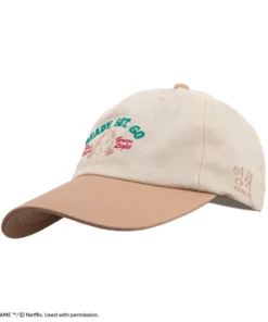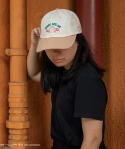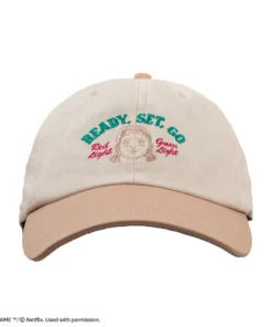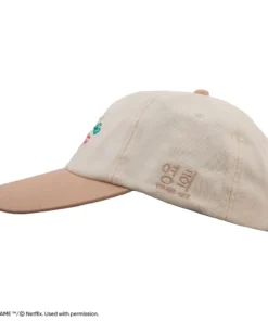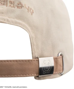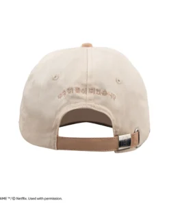The cap showcases popular words from the series in striking green lettering and a vibrant red Young-hee at the bottom, contrasting with the soft beige background. Get yours now and be ready to enter the arena.