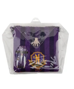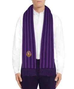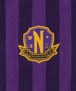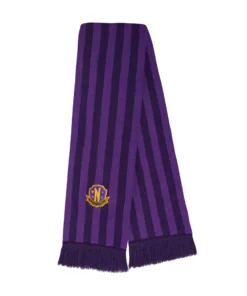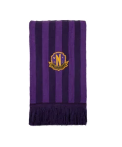 Keep warm and effortlessly cool with our purple Nevermore Academy scarf. It’s carefully chosen shades of purple make this hauntingly beautiful accessory the perfect addition to your wardrobe. At both ends of the scarf, you will find the iconic Nevermore Academy emblem, a symbol of the enigmatic institution.