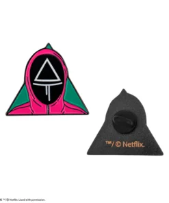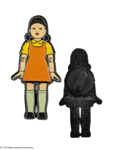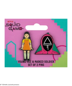 Enhance your pin collection with a set of two unique pins featuring Young-Hee, the scary doll from Squid Game, and one of the pink soldiers. The Young-Hee and soldier pins capture their haunting yet captivating presence.