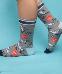 Two socks in this set embrace a more minimalist approach, adorned in a solid blue colour with an image of Hedwig taking center stage. In contrast, one sock features an all-over pattern that weaves together Hedwig’s presence alongside Harry Potter’s iconic glasses, the acceptance letter, the Gryffindor house symbol, and a Gryffindor scarf.